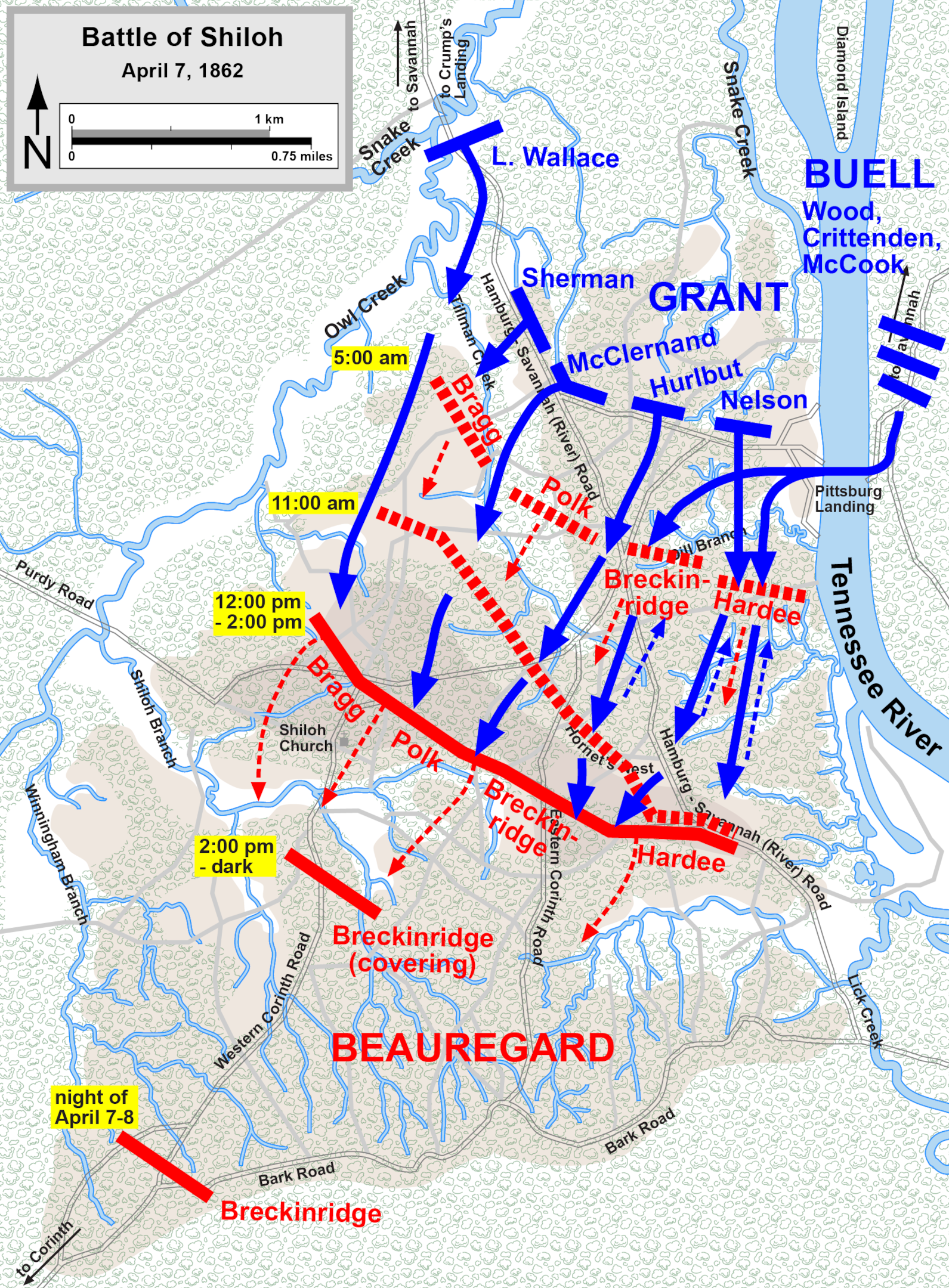 From Fort Henry, Ulysses S. Grant had his Federal force move toward Corinth, Mississippi, a railroad crossing. While moving toward Corinth, Grant’s Army of the Tenessee met Confederate troops under Albert Sydney Johnston at Pittsburgh Landing, Tennessee, on April 6, 1862. This was known as the battle of Shiloh and was initially going poorly for the Union until Johnston was shot and killed. P.G.T. Beauregard took command and renewed action the next day. However, Grant had been reinforced by Don Carlos Buell and the Army of the Ohio during the night. The Union was able to push the Confederates back and win the battle. However, they suffered staggering casualties. The highest to that point in American history.