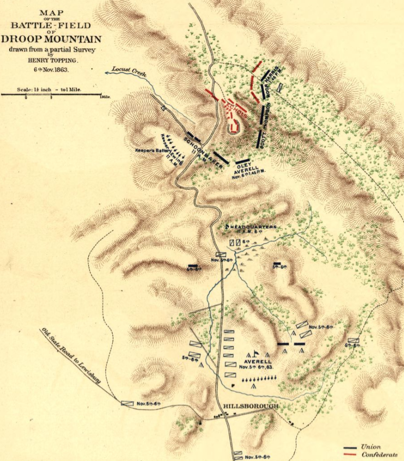 The engagement at Droop Mountain took place on November 6, 1863, when Union forces under Brigadier General William W. Averell launched their second attempt to disrupt the Virginia-Tennessee Railroad at Salem, Virginia. The Union troops, numbering about 5,000, were met by a Confederate force of approximately 1,700 men under the commander of Brigadier General John Echols. While they were outnumbered, the West Virginia State Parks website observes, Confederates had command of the high ground and blocked the route with artillery. The demographics of the units involved in the battle truly demonstrated the divisiveness of the war in West Virginia: The Union regiments included several West Virginia units – the 10th West Virginia Infantry, the 2nd, 3rd and 8th West Virginia Mounted Infantry Regiments, and the 1st West Virginia Light Artillery – while the Confederates’ 19th Virginia Cavalry comprised men largely from the same region as those of the Union’s 10th West Virginia Infantry. Furthermore, the engagement illustrated wartime family divisions as well: Among the West Virginians fighting on the Union side was Frank Dye, of Wood County, while his brother, Harrison Dye, served in the 22nd Virginia on the Confederate side, as Roy Bird Cook attested in his 1928 article on the battle.