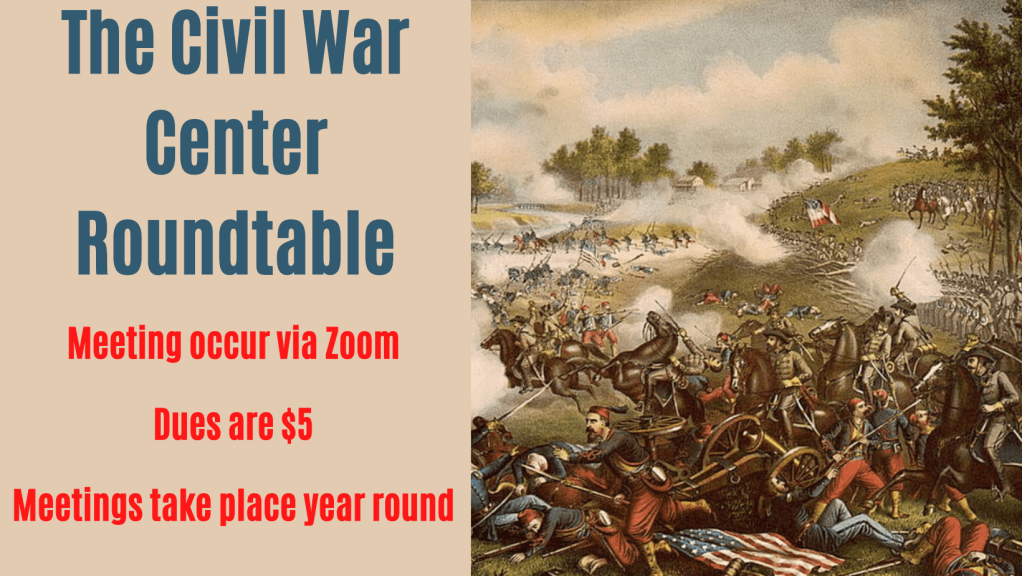 Complete the form and pay dues ($5 – this helps us bring in speakers and continue to preserve history) below to become a member of The Civil War Center Round Table.